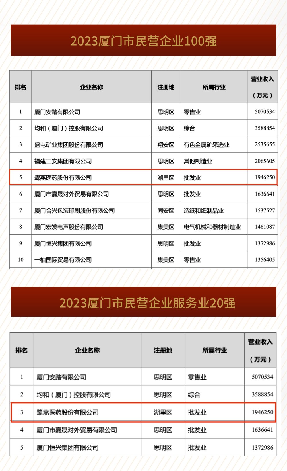 喜報(bào) | 鷺燕醫(yī)藥榮列2023廈門市民營(yíng)企業(yè)100強(qiáng)等系列榜單!